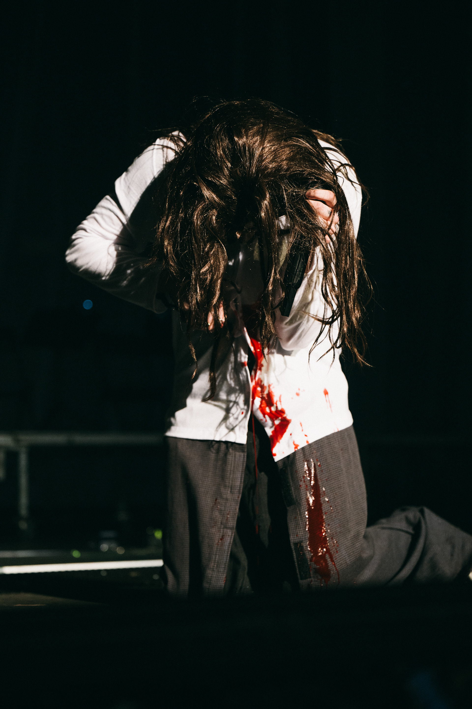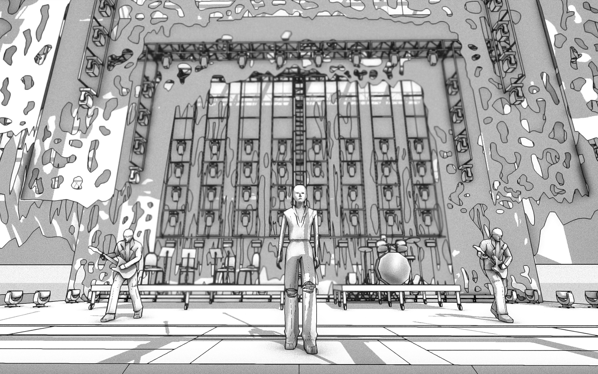Drawing from a psychological thriller universe, the stage is designed as a confined and reactive environment — evoking the sensation of an internal body space, where layers, textures and light define a visceral and unstable atmosphere.